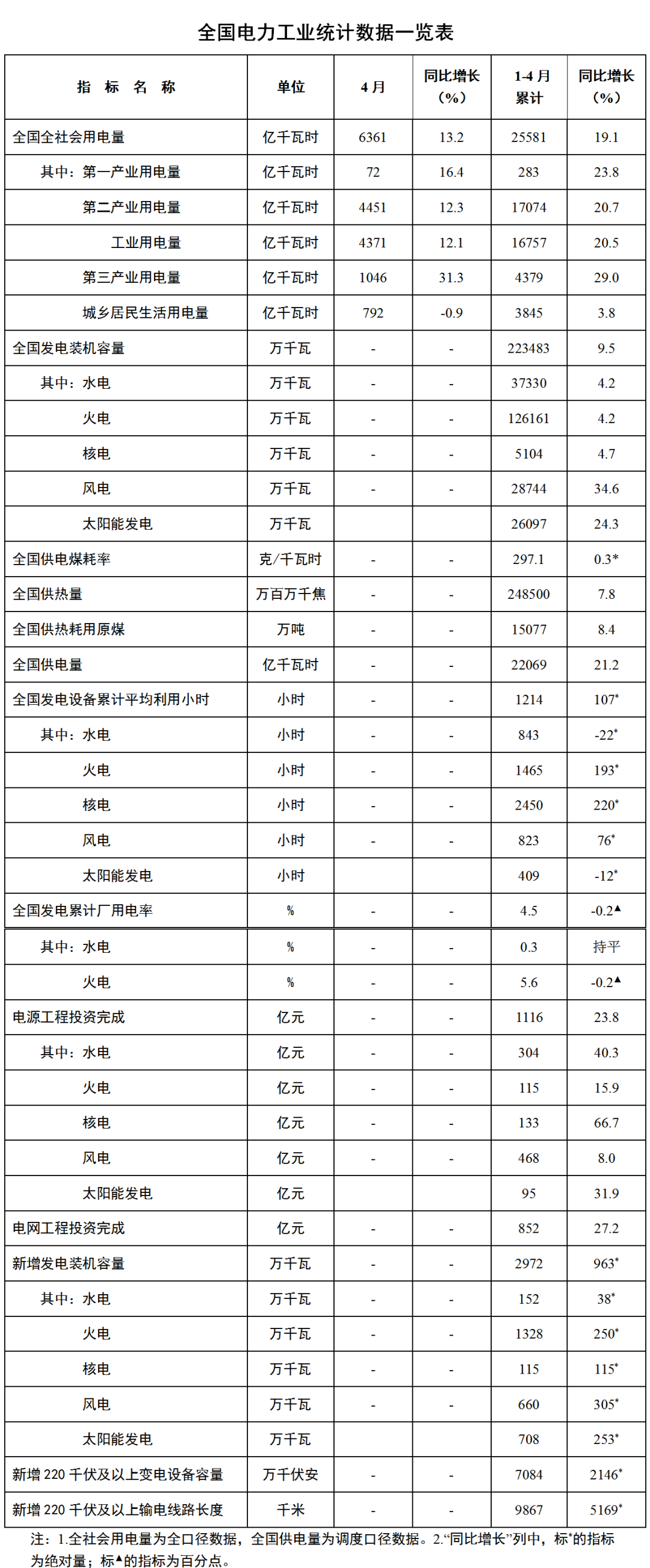 1-4月份,全國發電設備累計平均利用1214小時,比上年同期增加107小時。其中,核電2450小時,比上年同期增加220小時;風電823小時,比上年同期增加76小時。