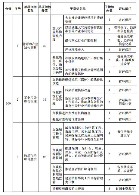 大氣污染防治重點任務完成情況包括能源和產業結構調整、工業污染綜合治理、揚塵污染綜合整治、機動車船排氣污染控制、綠色生態屏障建設、大氣污染防治資金投入、大氣環境管理等7項指標。大氣污染防治重點任務完成情況各指標的定義、評估要求和計分方法等由有關評估部門按照《二期行動計劃》的職責分工確定,評估部門根據子指標分值對各市重點任務進行打分,并向省環保廳提供評分結果。評估部門為兩個部門以上的,各評估部門分別打分后取平均值作為本項重點任務得分。