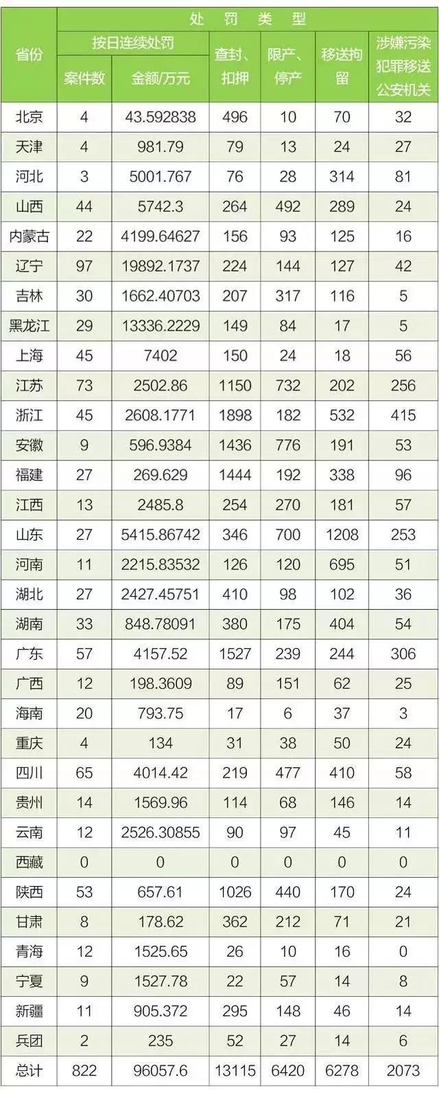 1-9月,全國實施五類案件總數28708件。同比去年1-9月增長146%。其中,按日連續處罰案件822件,比去年增長57%。罰款金額達96057.6萬元,比去年增長73%;查封、扣押案件13115件,比去年增長156%;限產、停產案件6420件,比去年增長170%;移送行政拘留6278起,比去年增長172%;移送涉嫌環境污染犯罪案件2073件,比去年增長53%。