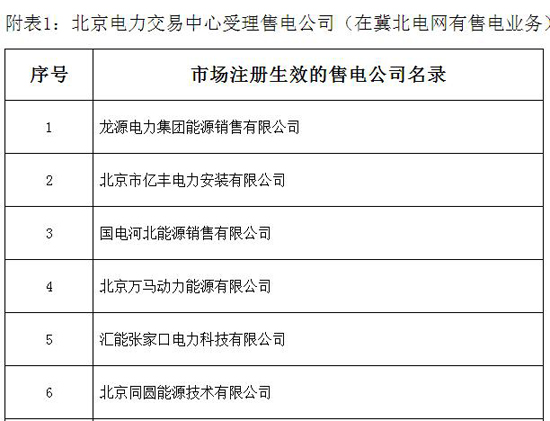 冀北電力交易中心有限公司于2017年10月19日至2017年11月19日共對(duì)13家售電公司進(jìn)行了公示,具體為:北京電力交易中心受理并在冀北電網(wǎng)有售電業(yè)務(wù)的龍?jiān)措娏瘓F(tuán)能源銷售有限公司等9家售電公司;北京電力交易中心推送業(yè)務(wù)范圍變更至冀北的北京經(jīng)開智控能源管理股份有限公司等4家售電公司。