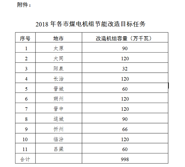 山西發(fā)布2018年各市煤電機組節(jié)能改造目標(biāo)任務(wù)