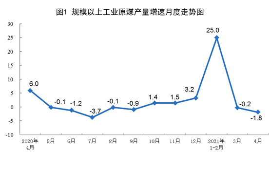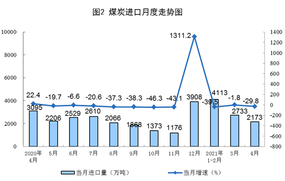 原煤生產(chǎn)有所下降。4月份,生產(chǎn)原煤3.2億噸,同比下降1.8%,比2019年4月份增長(zhǎng)4.0%,兩年平均增長(zhǎng)2.0%,日均產(chǎn)量1074萬噸;進(jìn)口煤炭2173萬噸,同比下降29.8%。