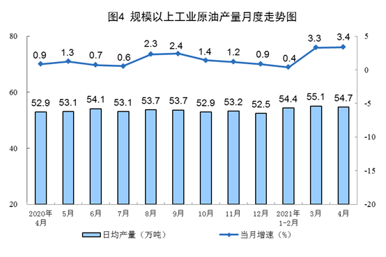 ? ? ? ?原油生產(chǎn)平穩(wěn),加工量保持增長(zhǎng)。4月份,生產(chǎn)原油1641萬噸,同比增長(zhǎng)3.4%,比2019年4月份增長(zhǎng)4.3%,兩年平均增長(zhǎng)2.1%,日均產(chǎn)量54.7萬噸。加工原油5790萬噸,同比增長(zhǎng)7.5%,比2019年4月份增長(zhǎng)8.3%,兩年平均增長(zhǎng)4.1%,日均加工193.0萬噸。