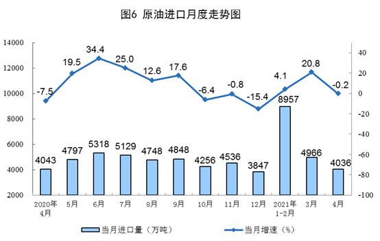 1-4月份,生產(chǎn)原油6563萬噸,同比增長(zhǎng)1.9%,比2019年1-4月份增長(zhǎng)3.9%,兩年平均增長(zhǎng)1.9%;加工原油23210萬噸,同比增長(zhǎng)14.2%,比2019年1-4月份增長(zhǎng)10.3%,兩年平均增長(zhǎng)5.0%。