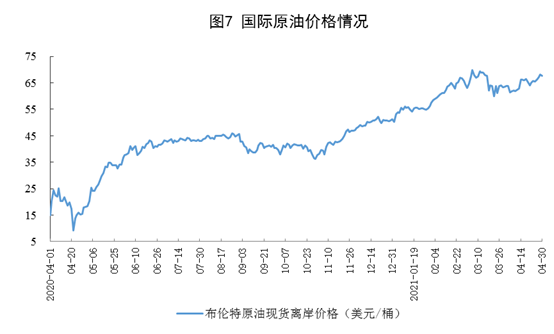 ? ? ? ?原油進(jìn)口由升轉(zhuǎn)降,國(guó)際原油價(jià)格有所上漲。4月份,進(jìn)口原油4036萬噸,同比下降0.2%;1-4月份,進(jìn)口原油17958萬噸,同比增長(zhǎng)7.2%。4月30日布倫特原油現(xiàn)貨離岸價(jià)格為67.73美元/桶,比3月31日的63.52美元/桶上漲6.6%。