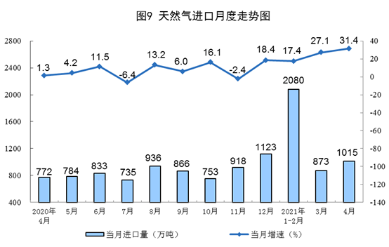 天然氣進(jìn)口增速加快。4月份,進(jìn)口天然氣1015萬噸,同比增長(zhǎng)31.4%。1-4月份,進(jìn)口天然氣3946萬噸,同比增長(zhǎng)22.4%。