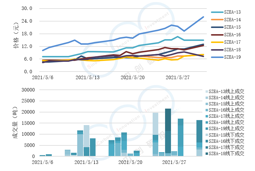 - 線上成交價最低為4.39(產(chǎn)品SZEA-18),最高為25.99元(產(chǎn)品SZEA-19),平均碳價為10.08元(平均碳價為各產(chǎn)品價格加權(quán)得出)。