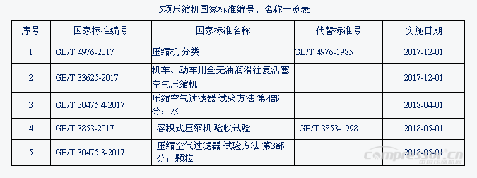 2017年第11號、第23號、第29號中華人民共和國國家標準公告,由國家質量監督檢驗檢疫總局、國家標準化管理委員會批準發布了共5項壓縮機國家標準,具體內容見表: