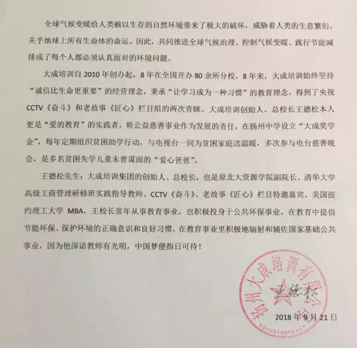 王德松先生:大成培訓集團的創始人、總校長,也是原北大資源學院副院長、清華大學高級工商管理研修班實踐指導教師、CCTV《奮斗》、老故事《匠心》欄目特邀嘉賓、美國紐約理工大學MBA。王校長常年從事教育事業,也積極投身于公共環保事業,他常常教導學生要注意節能環保、要保護我們生存環境。他在教育事業里積極地輻射和輔佐國家基礎公共事業,因為他深諳教師有光明,中國夢便指日可待!